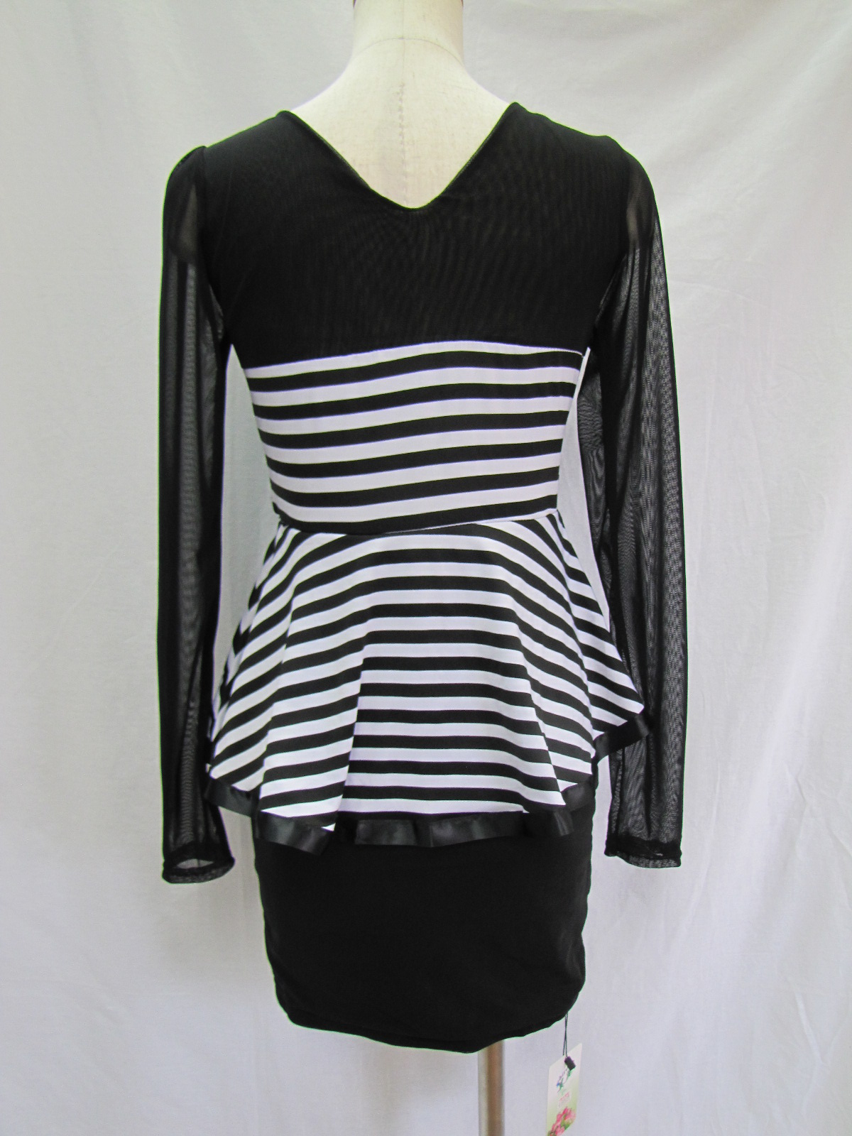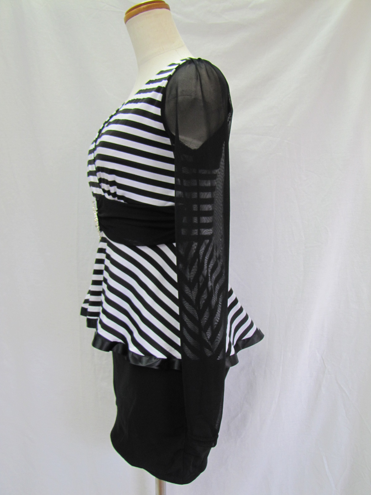 サイズS~М 黒白ストライプ ポリエステル95% ポリウレタン5% ファスナー無 裏地有 伸縮性有 着丈76㎝ バスト72~87㎝ ウェスト58~70㎝ カシュクールワンピースでベルト部分に装飾パーツでワンポイント。袖部分はシースルー素材