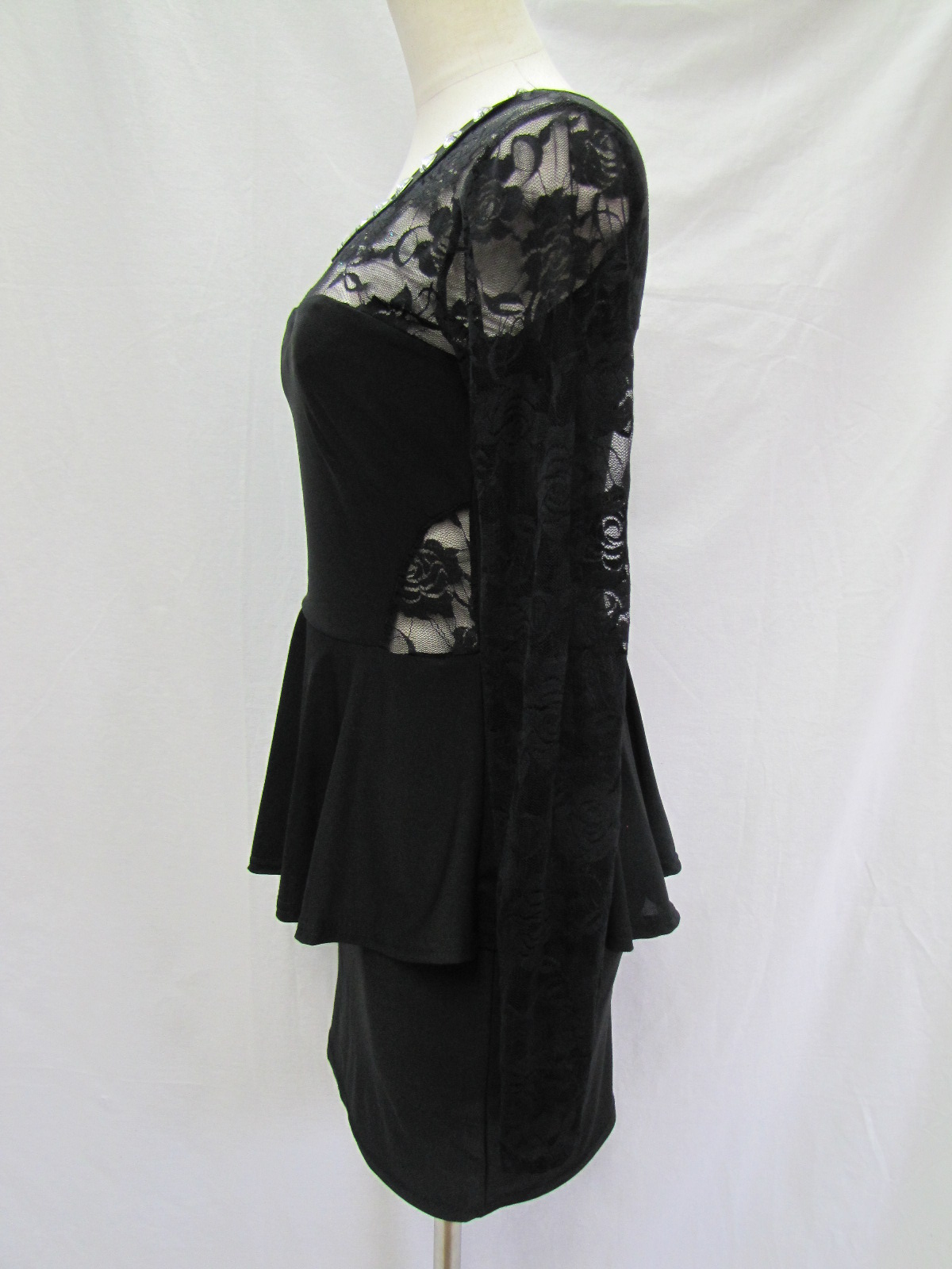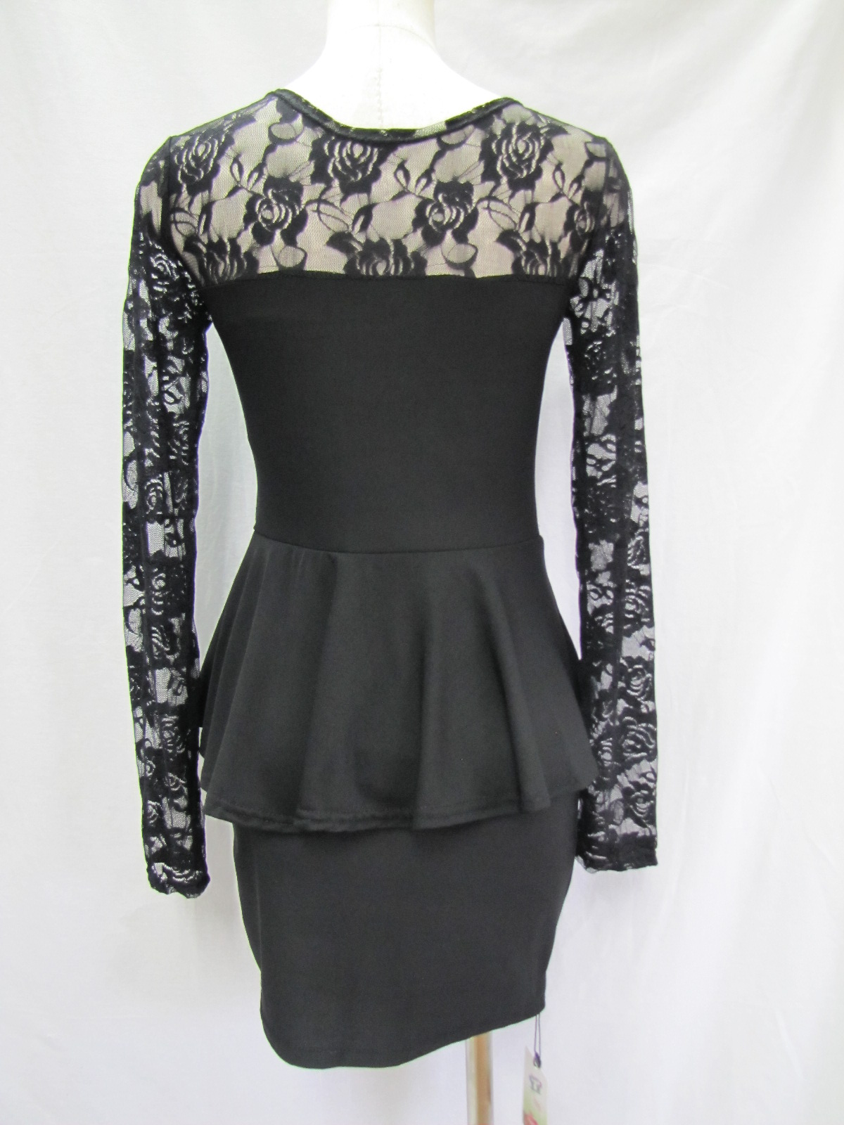 サイズS~М 黒色 ポリエステル95% ポリウレタン5% ファスナー無 裏地無 伸縮性有 着丈80㎝ バスト72~87㎝ ウェスト58~70㎝ ネックラインから袖にかけてレース。ぺプラムスカートで、ウェストを細く見せる効果があります。
