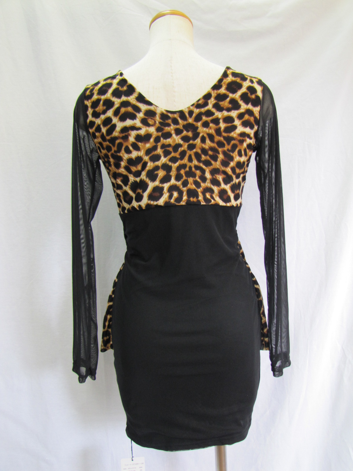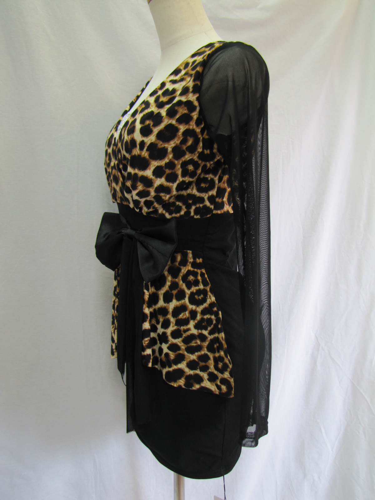 サイズS~М 黒×豹柄 ポリエステル95% ポリウレタン5% ファスナー無 裏地有 伸縮性有 着丈77㎝ バスト72~87㎝ ウェスト58~70㎝ カシュクールの胸元と前身ごろスカートは、豹柄パレオ風デザイン。 袖部分はシースルー。