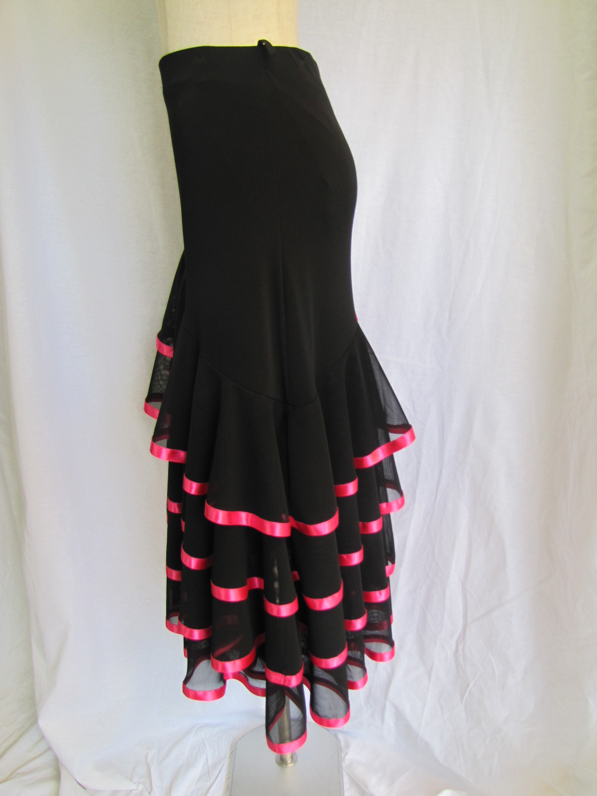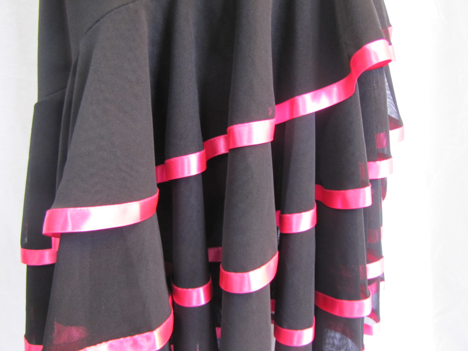 サイズМ~L 黒×チェリーピンク ポリエステル100% ファスナー無 裏地有 伸縮性有 長さ68~85㎝ 左右非対称のフレアスカート。チェリーピンクのライン綺麗でダンス等にもピッタリです。