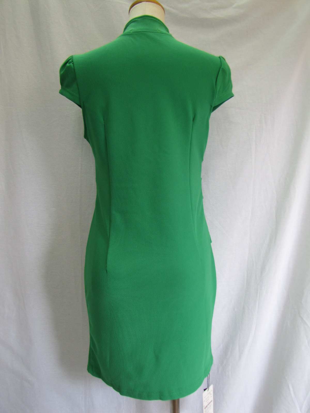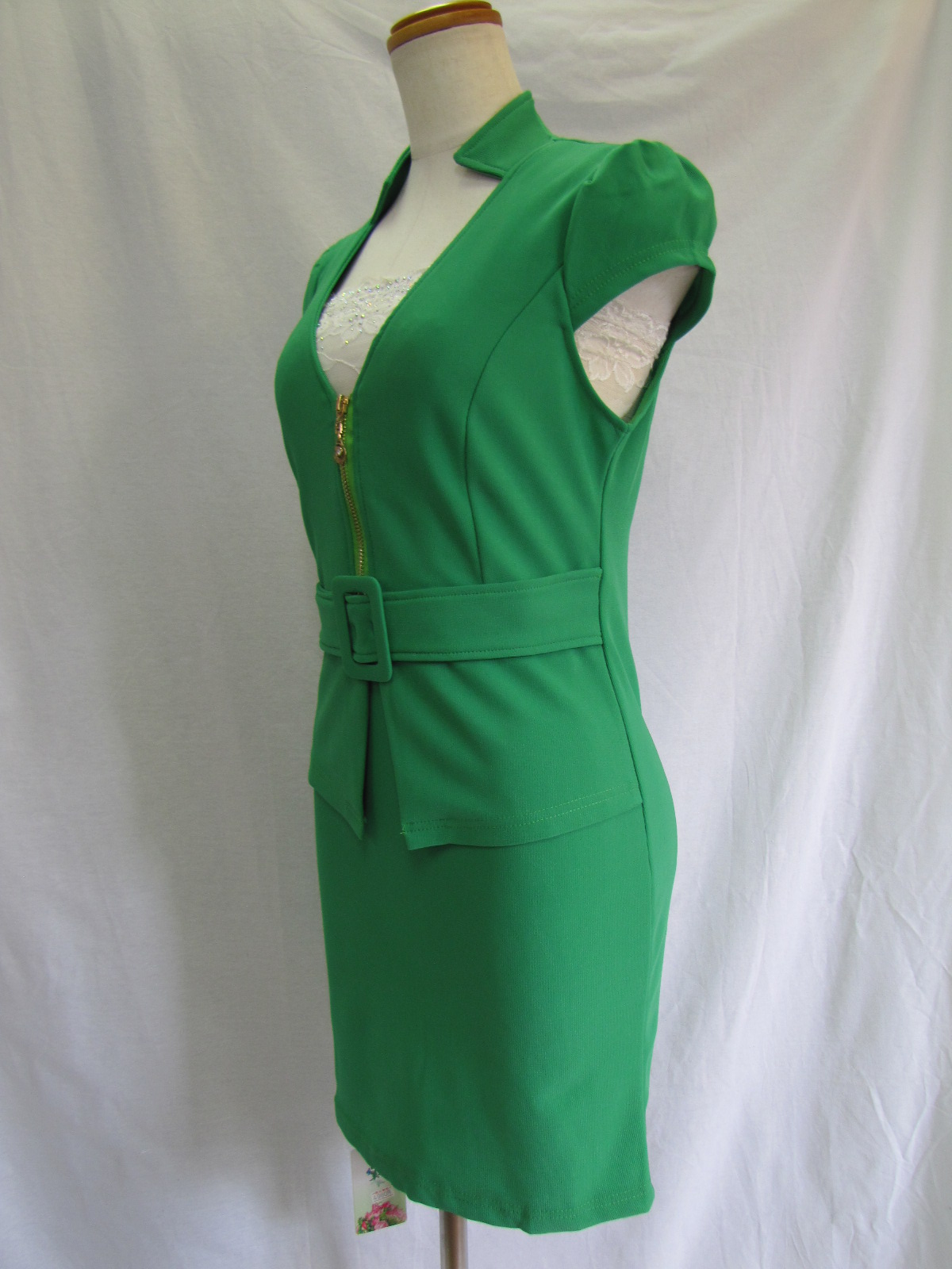 サイズS 緑色 ポリエステル95% ポリウレタン5% ファスナー前、脇 裏地無 伸縮性有 着丈78㎝ バスト72~80㎝ ウェスト58~64㎝ キャップスリーブでタイトなワンピースです。飾りベルト付。ウエストラインが細く見えます。